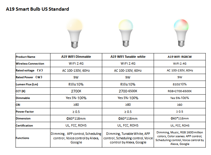 Dimming, Tunable White, Music Sync, RGB 16 million colors, Color scenes. APP control, Scheduling control, Voice control by Alexa, Google